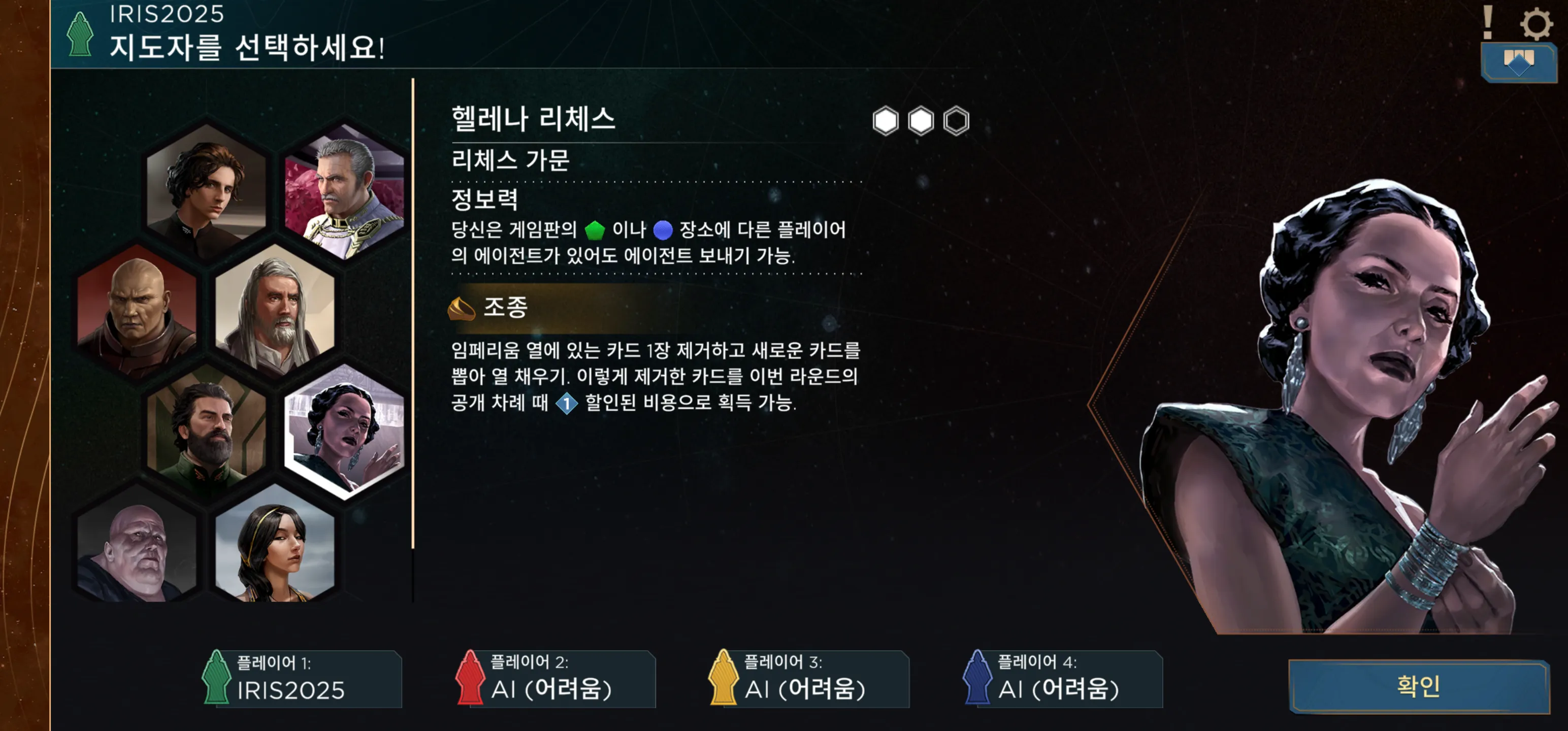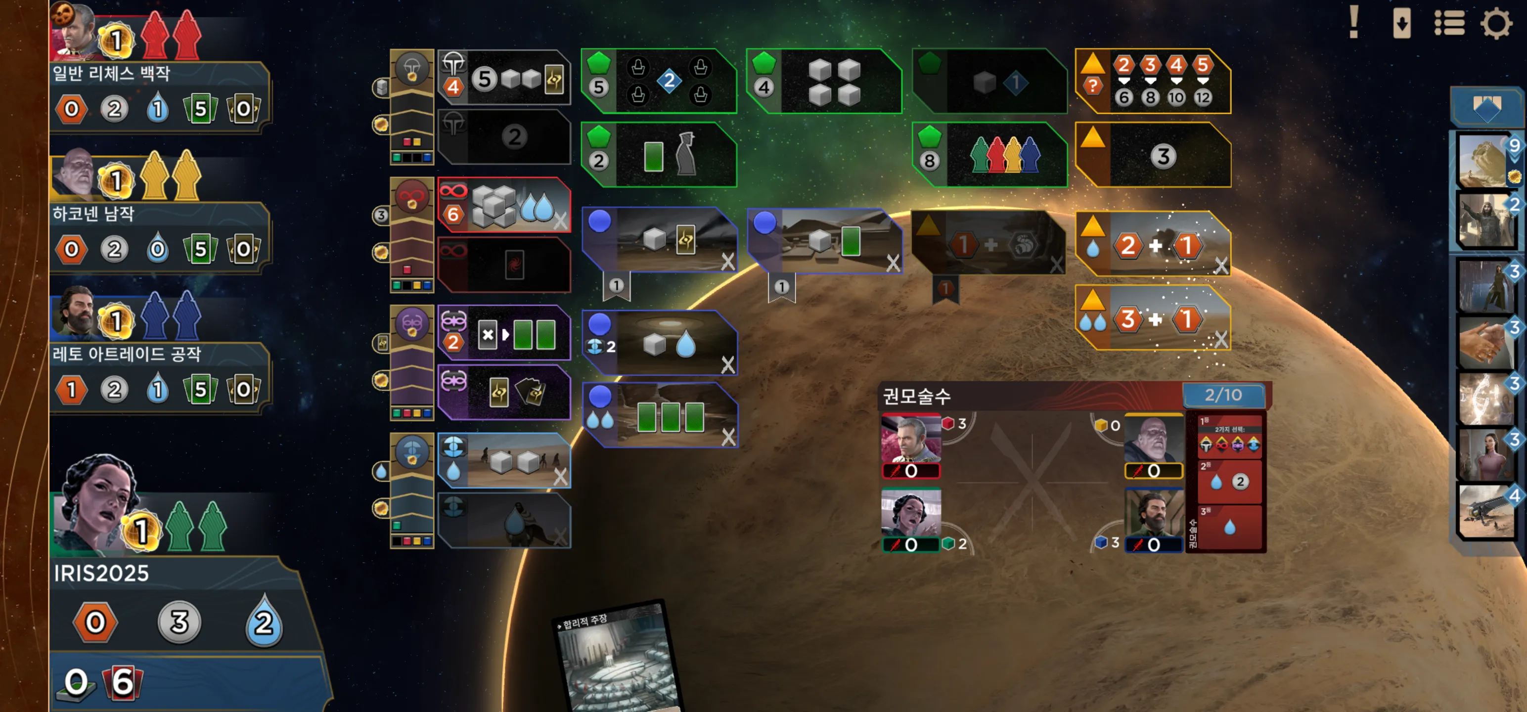 물 자원을 사용할 때마다 점수를 얻고, 우주 항행 길드 카드도 점수가 되기 때문에 이 두 가지를 염두에 두고 전략을 짜야 했습니다. 이런 운영 중심의 판에서는 안정적인 시장 관리가 가능한 “헬레나 리체스”가 최고의 선택이었습니다.