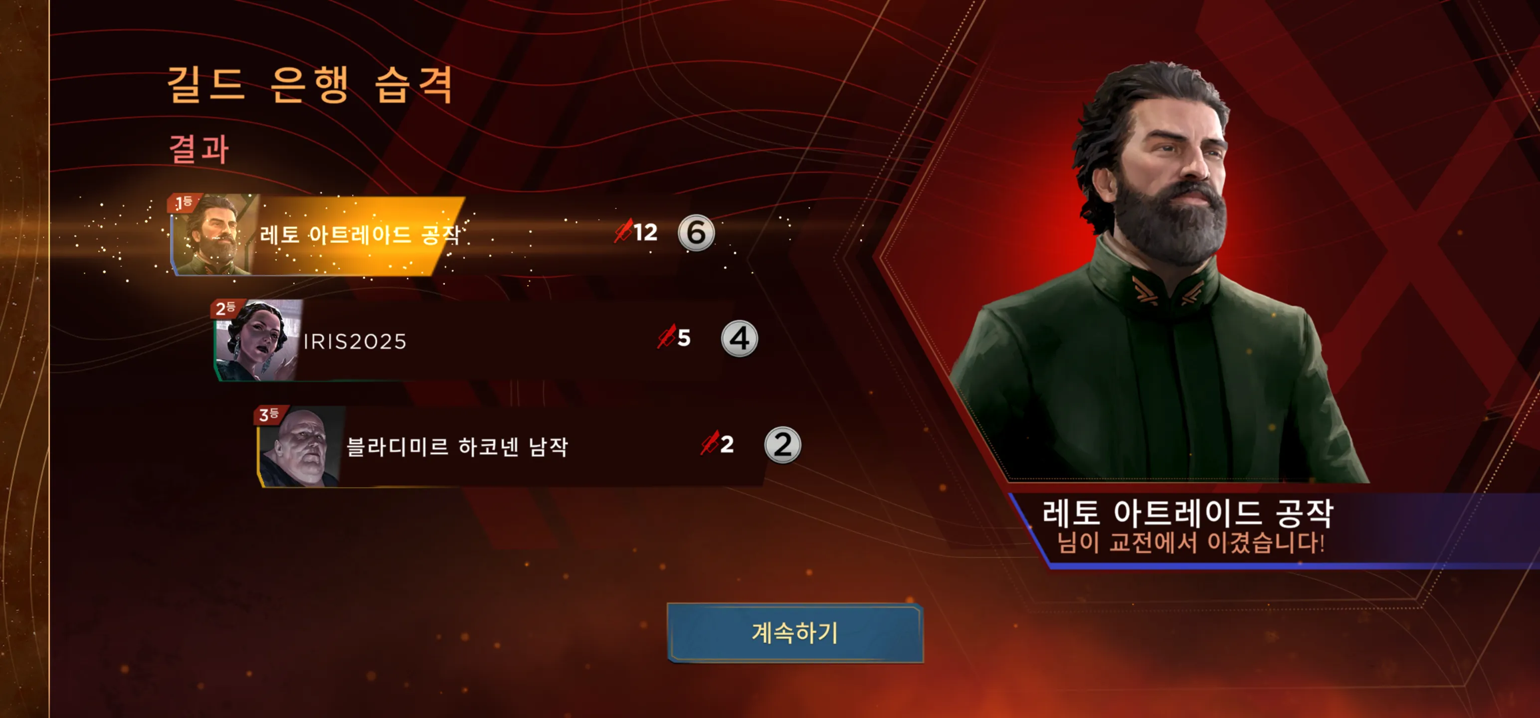 - 1라운드 (드러난 교전): 전투력 6을 투자해 2등으로 솔라리 3원을 획득했습니다. AI 하코넨 남작은 무려 전투력 9를 쏟아붓는 괴력을 보여주었습니다.