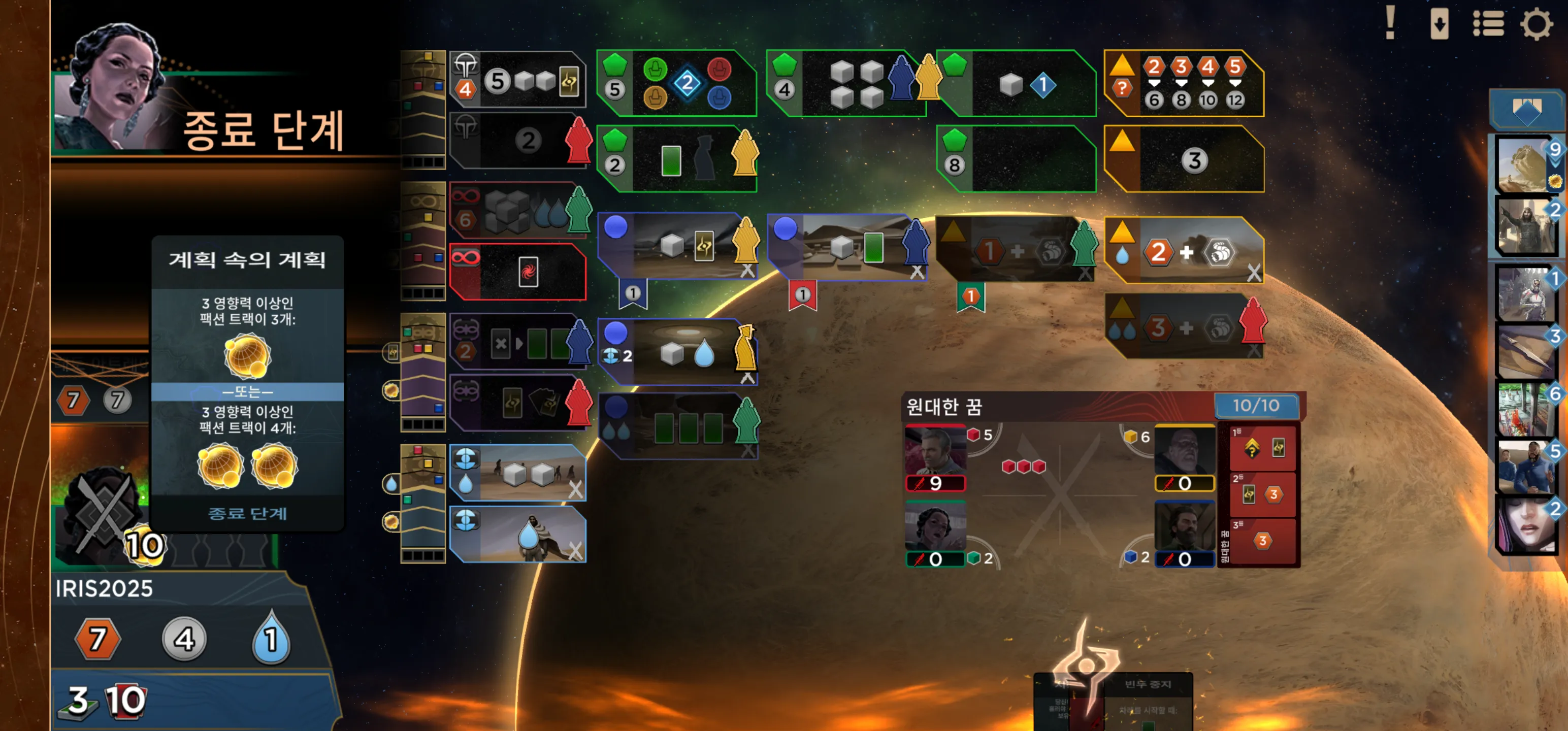 9라운드를 지나 대망의 마지막 10라운드가 시작되었습니다. 그런데 10라운드의 1등 보상이 승점이 아닌 팩션 영향력 2칸 상승이었습니다. 자칫하면 제가 가진 “계획 속의 계획” 계책 카드의 조건이 무너지거나, 다른 AI가 동맹을 빼앗아 갈 수도 있는 위험한 상황이었습니다.