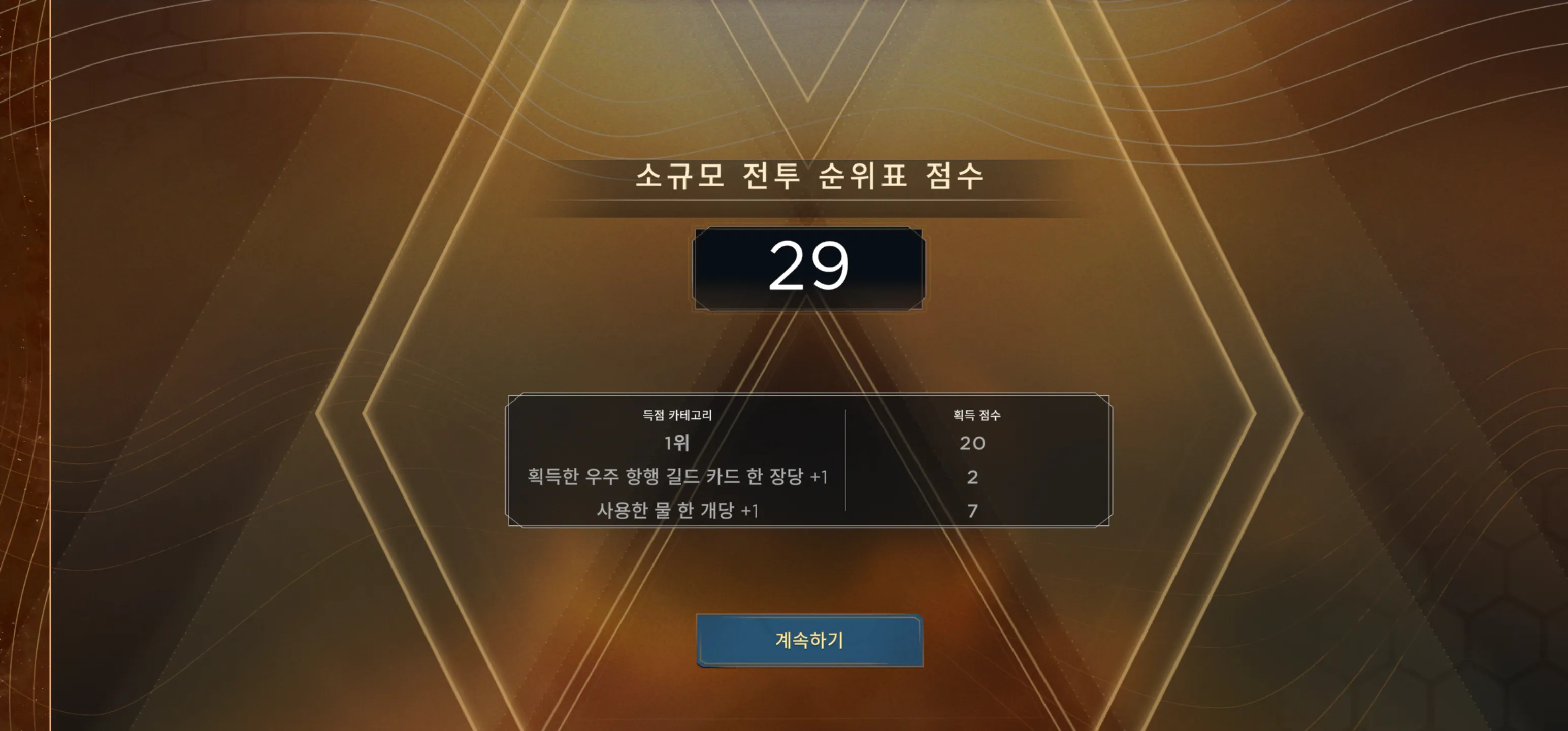 총 29점을 획득했습니다! 사용한 물 한 개당 1점씩 7점, 길드 카드로 2점을 챙기며 준수한 성적을 거뒀습니다.